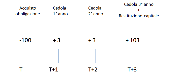 Ipotizzando un’obbligazione a tasso fisso della durata di 3 anni, tasso fisso del 3%, cedole annuali e prezzo di emissione pari a 100. Il flusso di cassa per l’investitore sarà pari a: